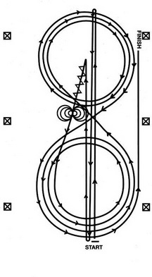6. Inicie na mão direita, complete 3 círculos à direita: os dois primeiros grandes e rápidos e o terceiro pequeno e lento. Trocar de mão no centro da arena