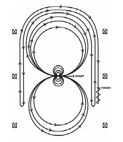 3. Inicie na mão direita, completando 02 círculos a direita. Pare no centro da arena. Pausa.