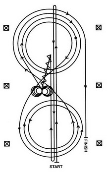 5. Complete 3 círculos para a direita. Dois grandes e rápidos e um pequeno e lento. Troque de mãos no centro da pista.